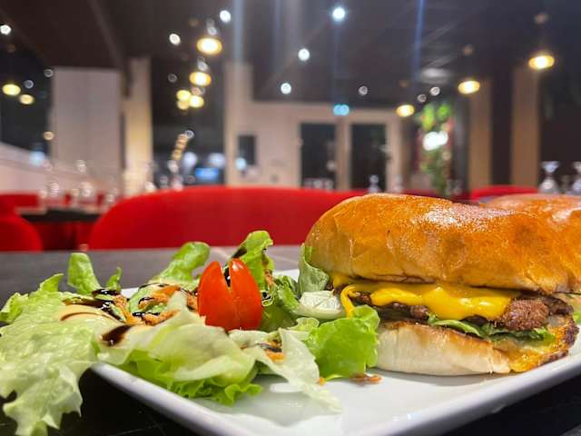 - Salade, oignons caramélisés, un steaks maison, cheddar, sauce burger maison.
