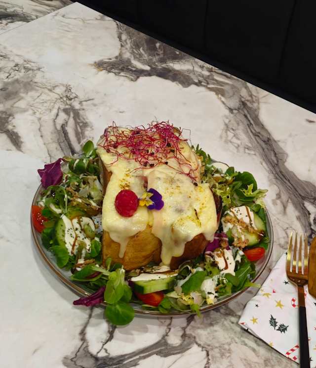 - Brioche garnie de pommes de terre et oignons bacon recouverte de raclette grillée, servie avec une salade