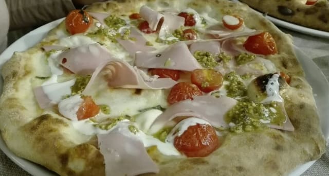 mortadella, stracciatella, pesto di pistacchi, olio evo