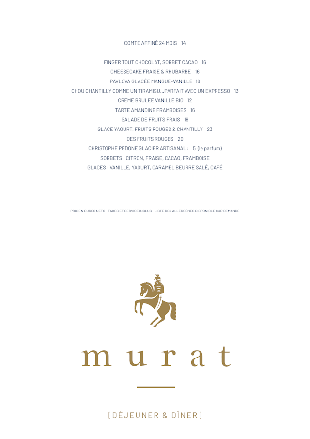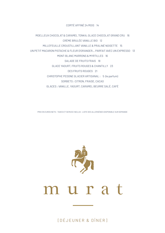 9.5/10As always, dining at Le Murat is an all-around great experience. From the food to the atmosphere and service, everything is consistently excellent.