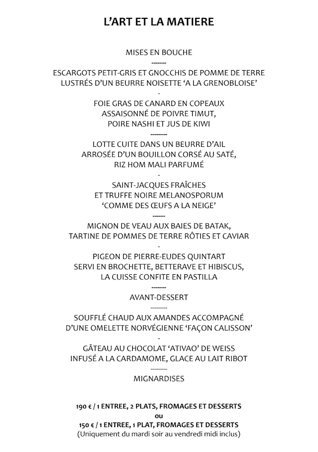 10/10+1Chef’s Tasting Menu with wine pairing!! The most fabulous meal we had while in France!! Every bite was a joy!! Delicious flavors. No one dish overpowered another but complemented to each other as you transitioned from dish to dish!! Waitstaff very kindly and patiently translated to English for us. Exceptional service! A joy to be there!