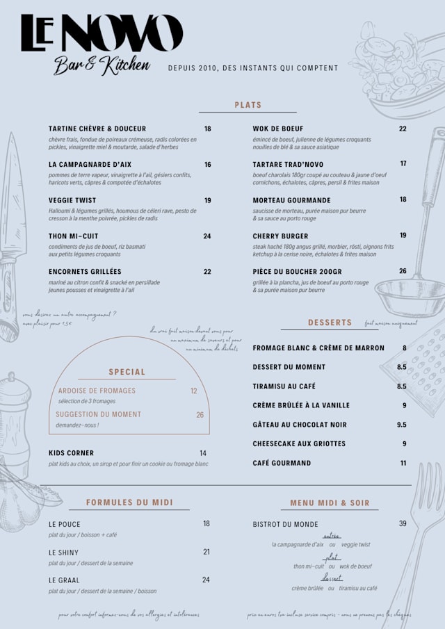 BELLE TABLE - À mi-chemin entre le bistro branché et la cave à vin - bar à cocktail, le restaurant Le Novo est une table qui s'adapte à toutes les occasions. Petit déj' ou repas du midi aux saveurs italiennes et provençales, soirées tapas espagnoles et cocktail sous lumières tamisées pour se prélass...