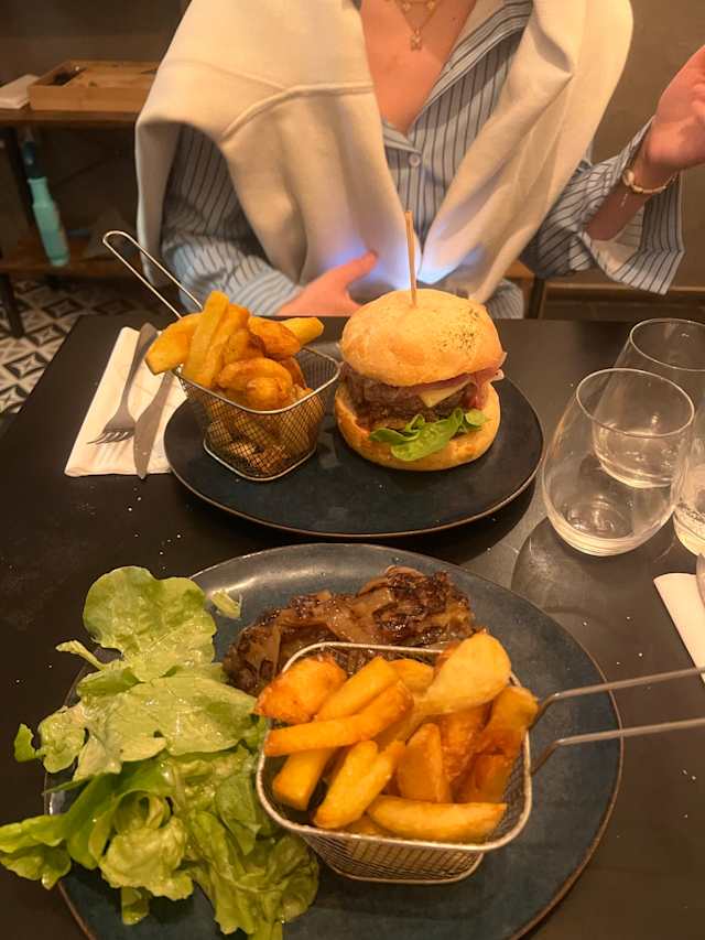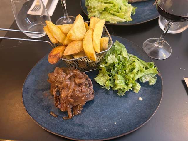 - Bavette de taureau grillée servi avec frites maison et confit d'oignon (180g)