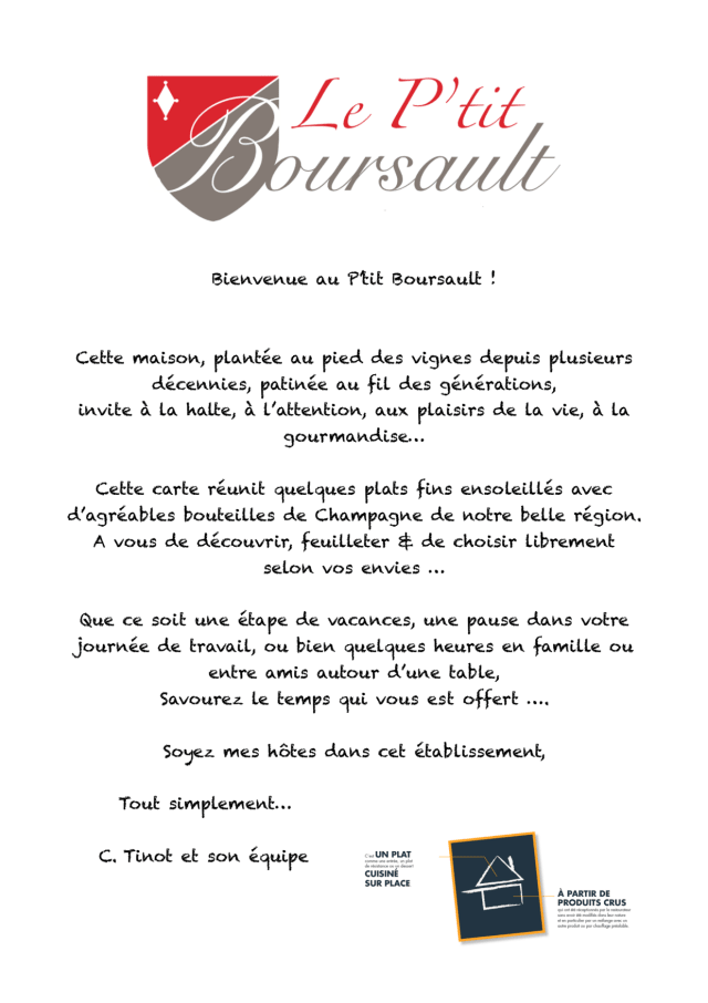 Mettre en avant le château de Boursault ainsi que les gites et cave de champagne ainsi que la route touristique du champagne Le service des champagnes de petit producteur a " petit prix" ainsi que la vente de planche de cochonnaille, produit frais régionaux et notre carte entière " fais maison "