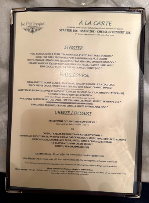 10/10Lovely place. Very intimate. Staff very polite. Food came quickly and was absolutely wonderful. We had the piperade and foie gras de veau as starters and the bœuf bourguignon and roasted pork for mains. Great! Would definitely come back!