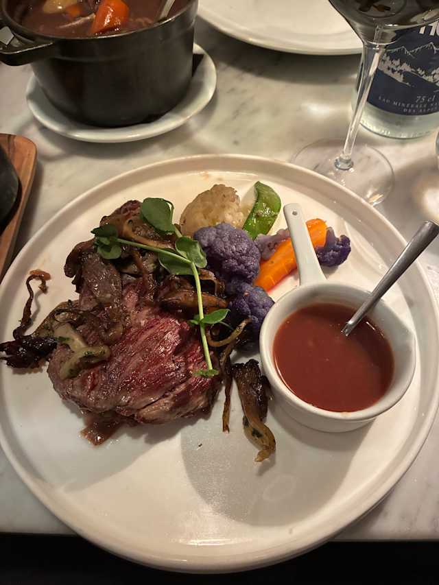 - Beef stewed in red wine sauce, served in iron cast cocotte