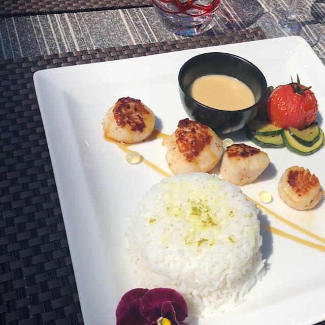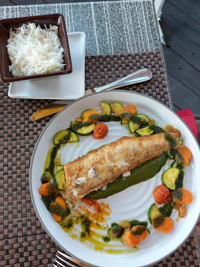 Le dos de cabillaud en croûte de parmesan et harissa beurre blanc coco citron légumes du marché, riz basmati