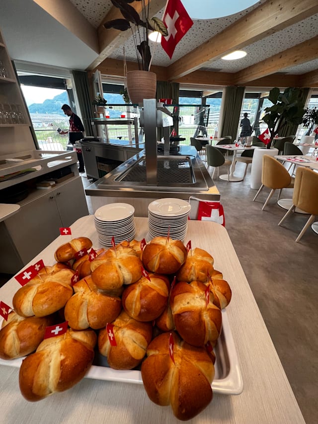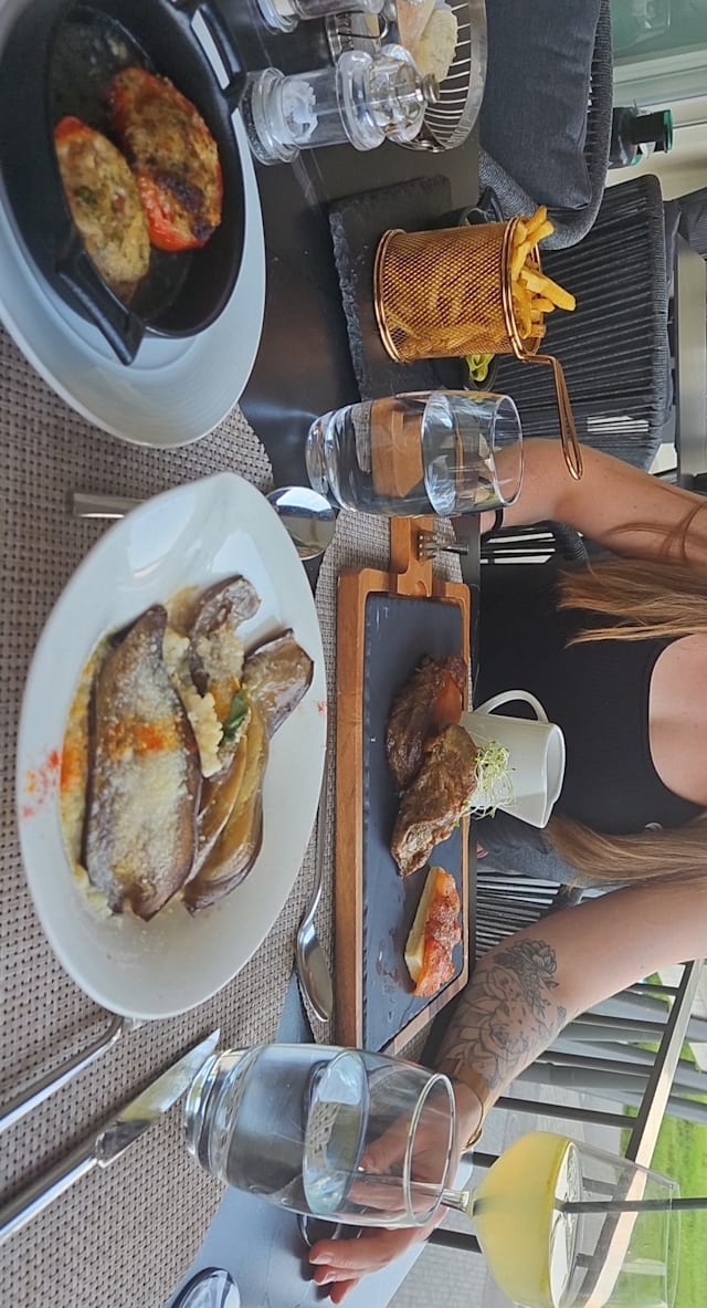 Risotto crémeux, mijoté dans un bouillon parfumé, enrobé de morceaux d’ aubergine fondante légèrement rôtie et nappé d’ un filet d’huile d’ olive vierge. 1 accompagnement au choix par plat : frites fraîches / rösti ou spätzli