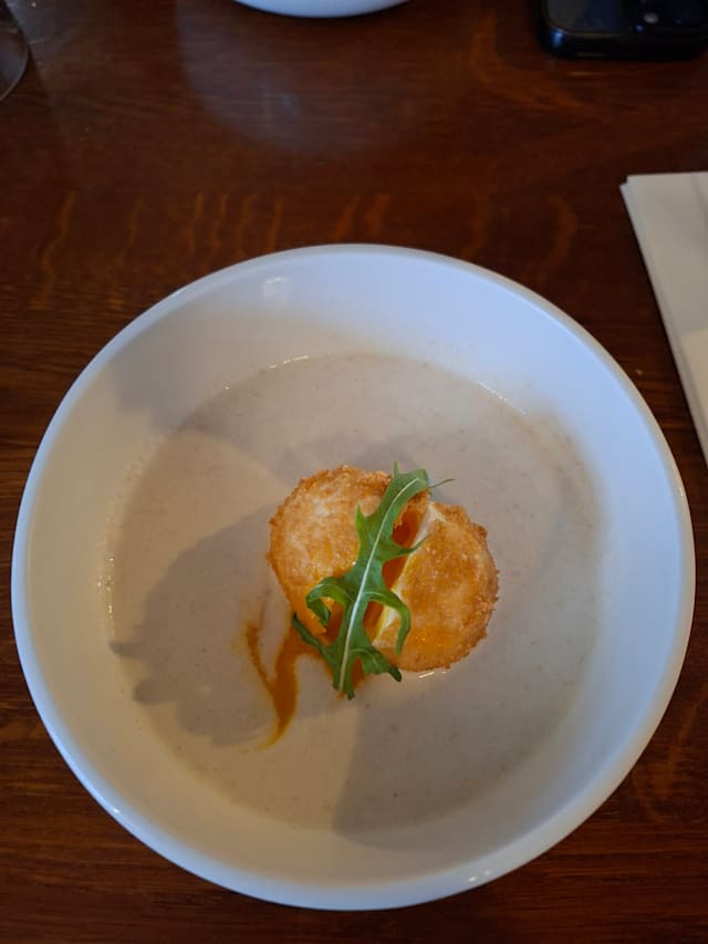 8/10Very pleasant--happy diners sitting outside on a warm night--poulardes with petit poie in a porc bouillon-- interesting and delicious. A bit salty but from the sea. My wife had rillettes made into a presse--she was happy-- an easy pleasant evening in a neighborhood cafe.