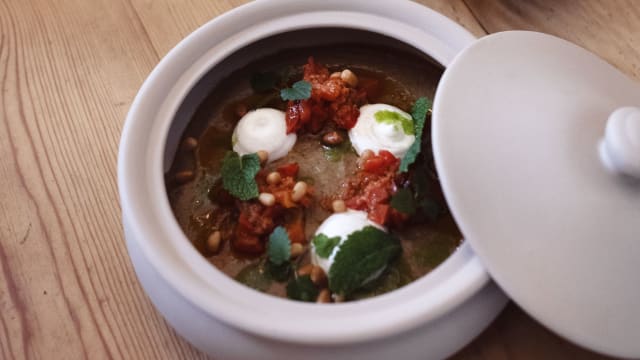 - Façon gravlax, huile fumée, échalotes, pickles de graines de moutarde, œuf de saumon, salicorne, stracciatella, condiment à l’aneth citronné