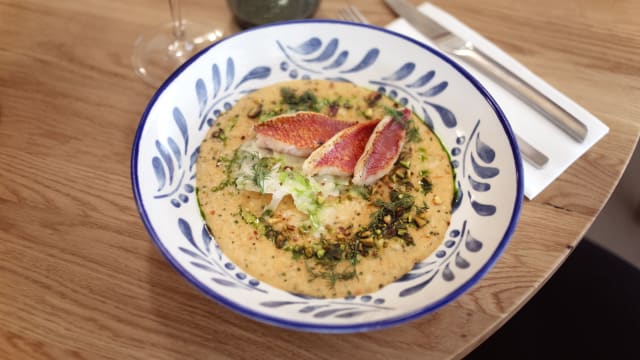 - Poireau braisé, sauce beurre blanc aux oeufs de hareng fumé servi avec frites de polenta