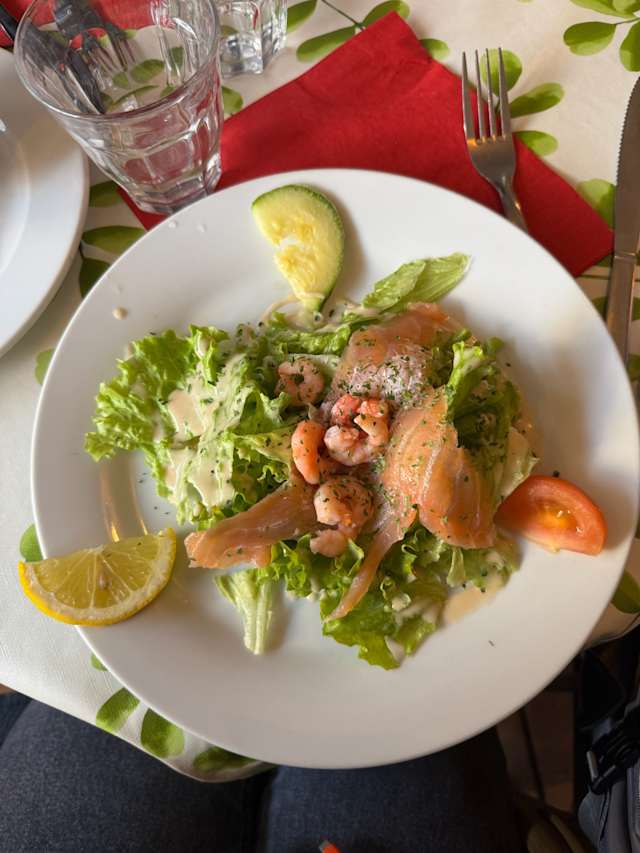 - Salade Parnasse (salade, crevettes, saumon fumé, tomates, crème fraîche)