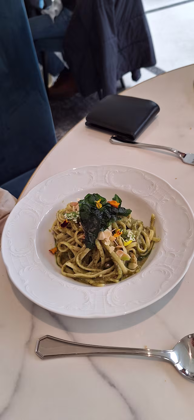 - Spaghetti al dente servis avec un pesto aux amandes fait maison et amandes torréfiées.