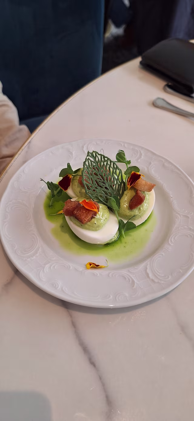 - Truite gravlax faite maison, servie avec une crème aux herbes fraîches, des œufs de truite et une huile aux épinards.