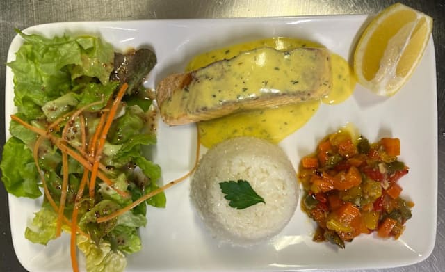 - Suprême de poulet grillé, croûtons dorés, copeaux de parmesan, salade, tomates cerises, œuf dur, sauce césar maison