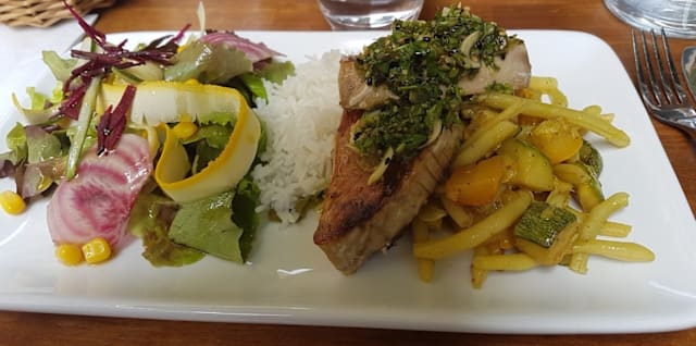 - Thon, œufs durs, haricots verts, tomates cerises, olives noires, cœur de laitue