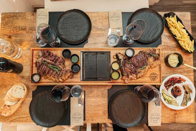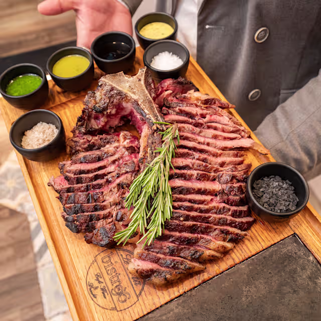 - Black angus australiano incrociato con wagyu, taglio ribeye con osso lungo e curvo. La sua carne è caratterizzata da un'ampia marmorizzazione e un sapore intenso, con note di burro e frutta secca. Allevato in libertà nelle praterie australiane, garantisce tenerezza e un gusto unico.