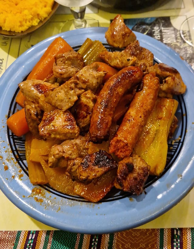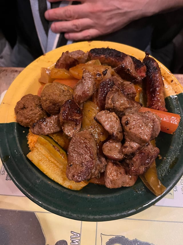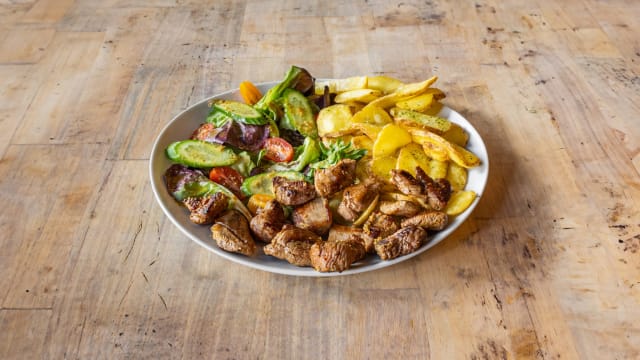 Choix de: brochettes, poulet, merguez, boulettes, et plus