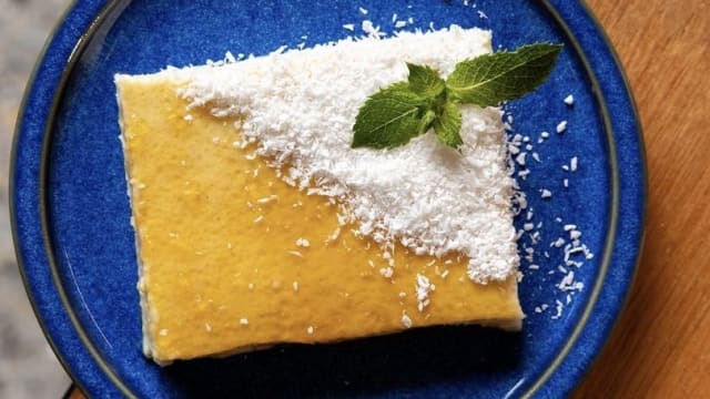 Dessert maison, légèrement sucré ; aux oeufs et lait de coco relevé par un sirop de citron vert et coco râpée.