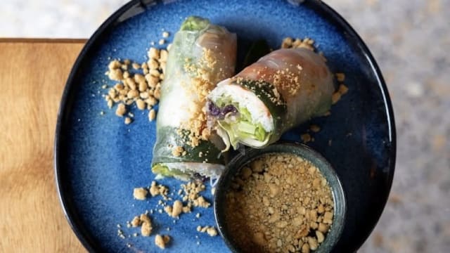 Composée de crevettes, de choux rouge, carotte, salade coupée, soja frais, feuilles de menthe fraîche, basilic thaï. Garnie de cacahuètes pilées, ciboulette, coriandre fraîche et de sauces maison