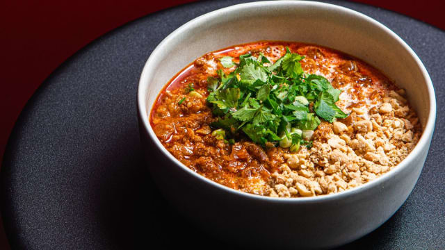 Savoureux mélange épicé de porc haché et de crevettes, oignons, cacahuètes et lait de coco, parfumé au saté. Accompagné de riz blanc parfumé au jasmin.