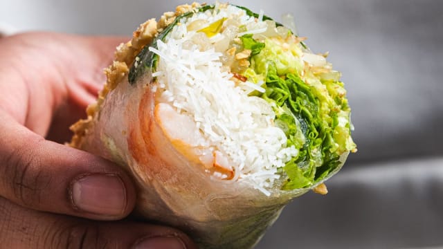 Roulé à la commande dans une fine galette de riz et recouvert de cacahuètes.