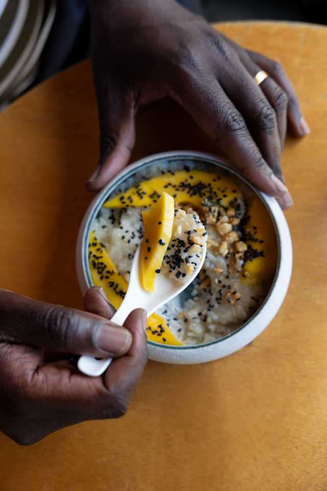 - Onctueux riz au lait de coco, agrémenté de morceaux de mangue fraîche : un vrai délice !