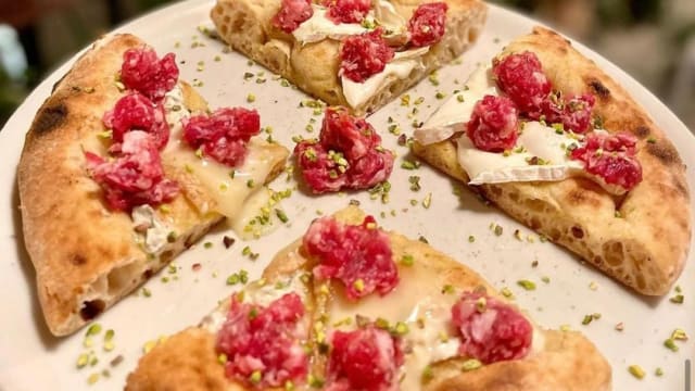 Impasto le petit jardin, mozzarella di bufala moris di cuneo, salsiccia di wally (vitella cruda), pomodoro cuore di bue condito, noci e olio di oliva roi di badalucco