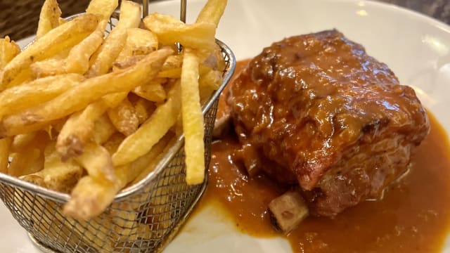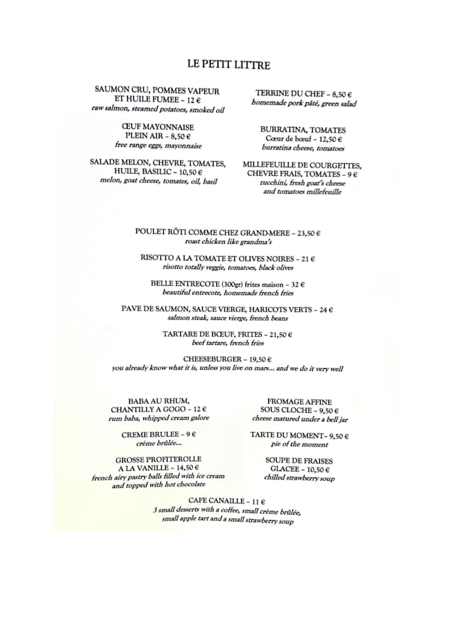 6/10Le Petit Littre is on a cute side street and the atmosphere is charming. The food was very underwhelming. I had fish that was well seasoned, but presented on top of an entire plateful of over cooked, heavily buttered snow peas. My son had the steak, which was extremely tough and full of tendons. He had a difficult time cutting it and even harder time chewing it. The meat wasn’t seasoned and the fries it came with were limp and soggy. We chose this restaurant based on previous reviews and were very disappointed in both the quality and taste of the food. It was a shame.