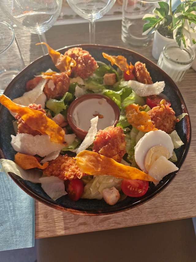 - Filets de poulets panés croustillants, salade, tomates, euf, croûtons, parmesan, ciboulette et sauce césar maison.
