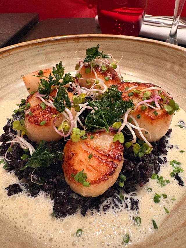 les noix de st Jacques poelées , riz noir, sauce bonne femme
