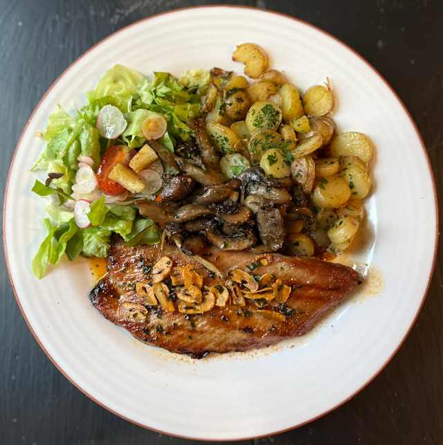 - Pavé de morue grillée, accompagné de pommes de terre à "murro" et légumes du jardin
