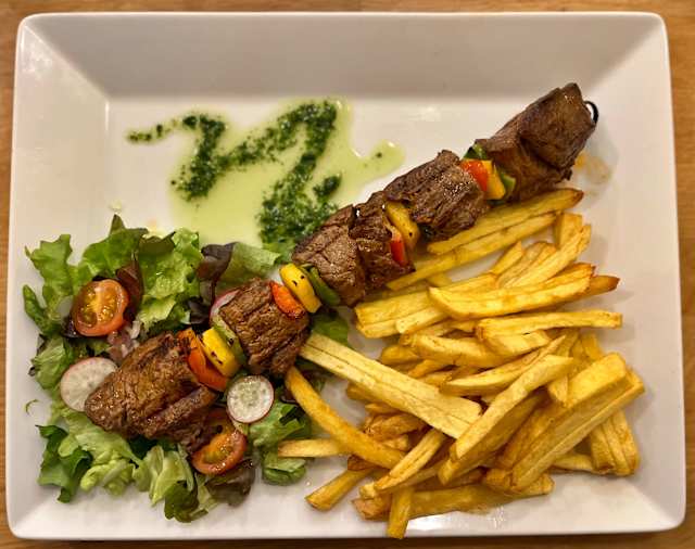 - Coeur de rumsteak de boeuf (≈ 250g), accompagné de frites**, de salade et de riz à la carotte sauce au poivre et sauce aux échalotes