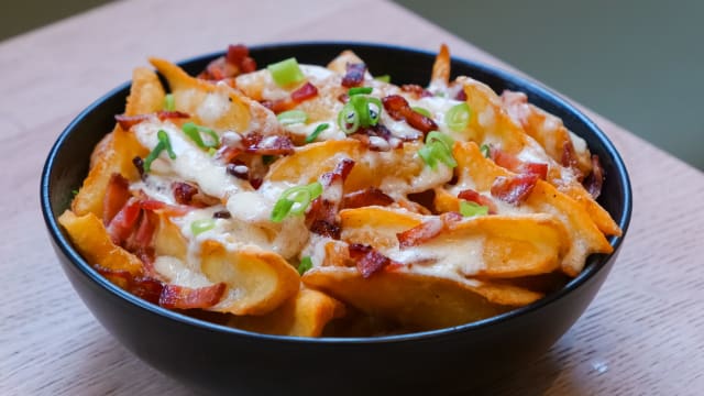 - Frites garnies à la sauce raclette et chips de bacon au sirop d’érable