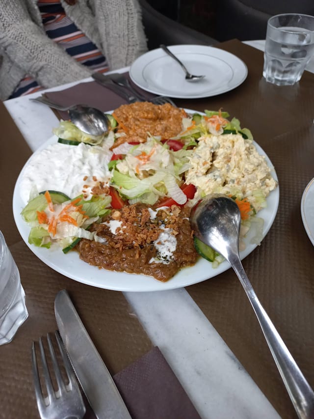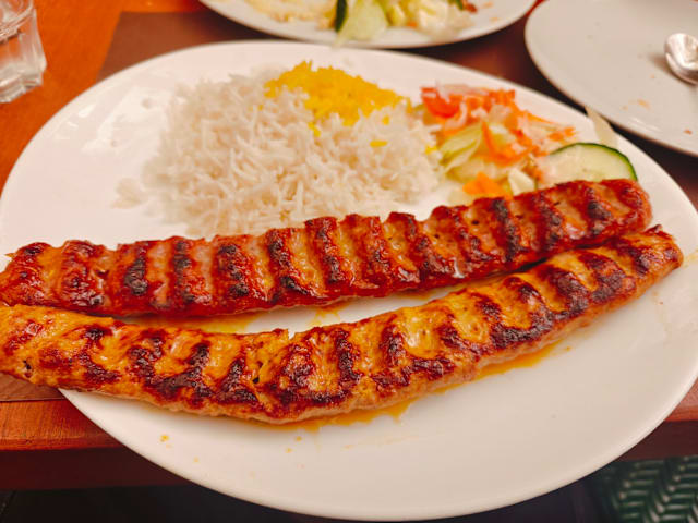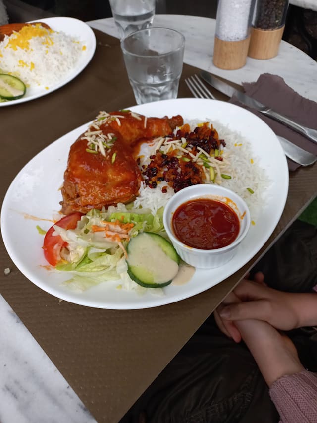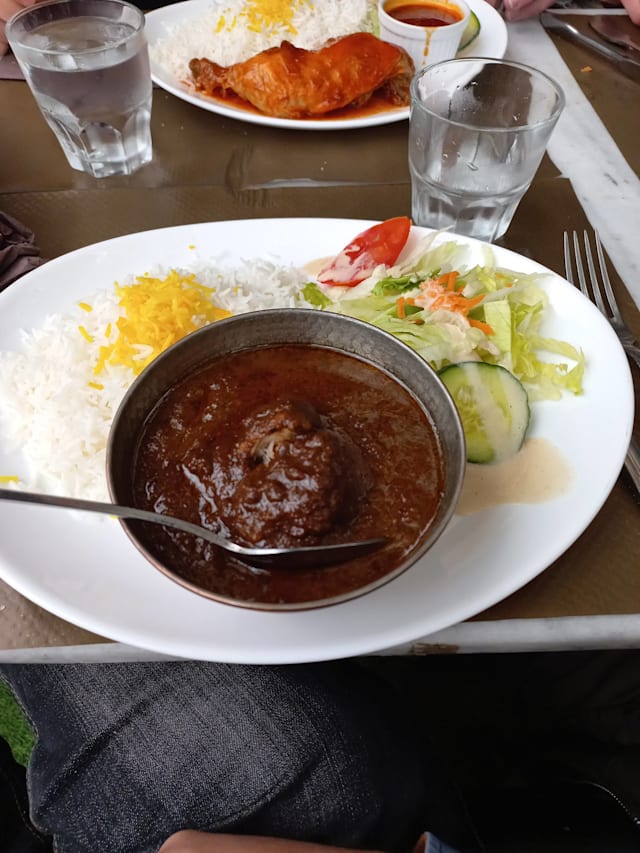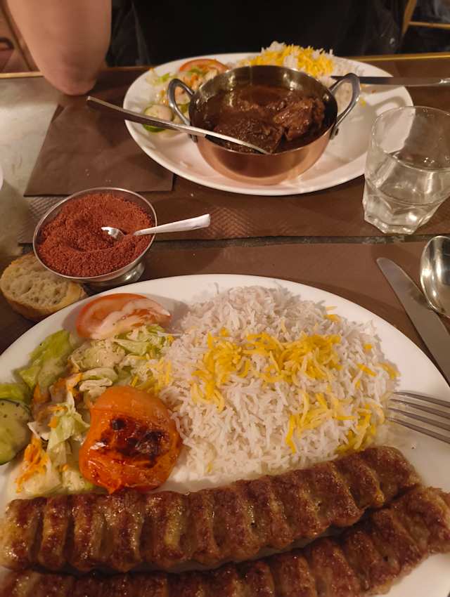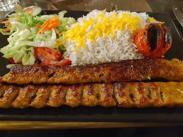 Selle d'agneau hachée et oignons avec son riz iranien et salade Bakhtiari