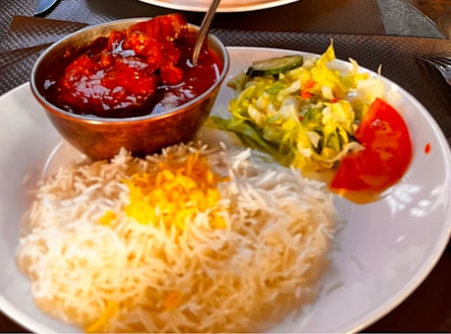 Veau, sauce tomate, aubergines grillées avec son riz iranien et salade