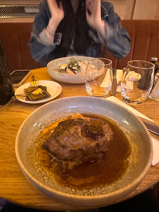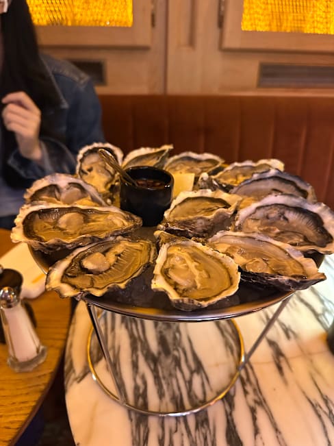 8.5/10It was a busy place so service was missed a bit especially the guy server all hustle and bustle. The female was much nicer. The food was alright oysters aren’t great here because they don’t help you remove the muscle connected to the bottom shell and that’s how you know a good oyster place from a so/so one. Beef cheeks were tough but the salmon was good