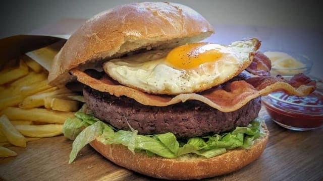 200 g di black angus, ngus, cheddar, cheddar, sottiletta, sottiletta, insalata e pancetta buns artigianale fatto in casa, servito con patatine dippers