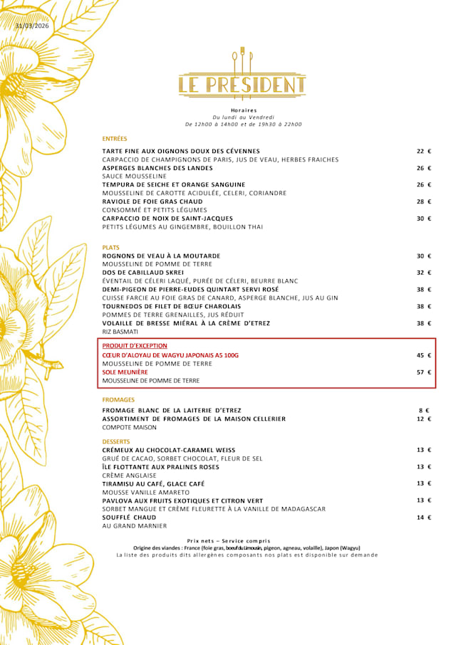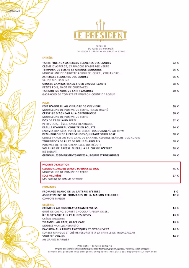 Le President was a wonderful experience. The head chef was not on duty this evening however the quality remained excellent! I dined with a group of 8 colleagues. Our meals were well presented and a pleasure to the pallet! If I ever get the opportunity to return to Lyon Le President will be on my list! Merci beacoup Le President staff!