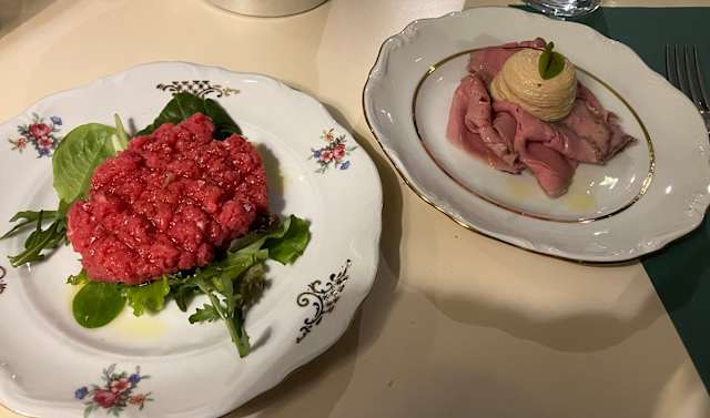 - Insalata russa, tomino, acciughe al verde, battuta, lingua al bagnetto rosso, sformato del giorno, vitello tonnato, peperone in bagna cauda e antipasti del giorno