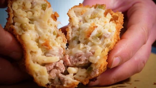 Arancino di riso con piselli, carne macinata, pomodoro, provola, pepe e parmigiano reggiano DOP