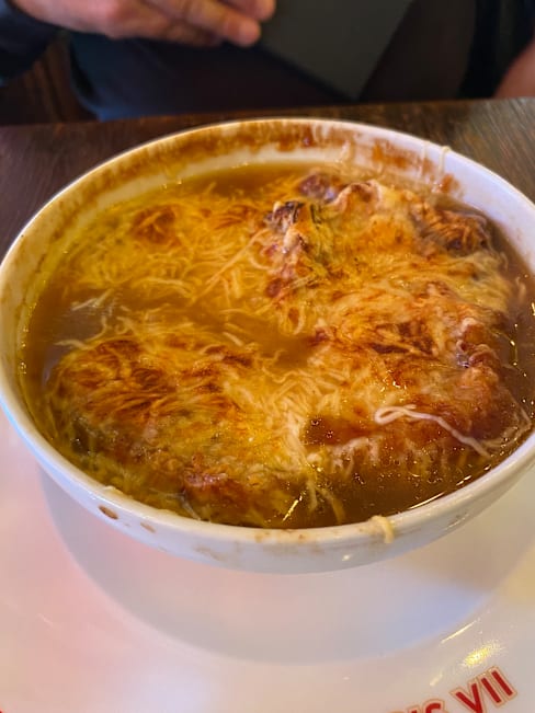 10/10We had a wonderful meal here after touring the Eiffel Tower. We arrived half an hour early than our reservation but the waitress let us in and asked us of we preferred indoor or outdoor seating. It was freezing though sunny so we stayed indoors. Servers are very attentive, cheerful and spoke English. The onion soup was delicious, well balanced flavors and I loved the generous amount of cheese and the crisp baguette in it. My partner enjoyed the steak frites done to his liking. The fries were very good too. Ambience was cute though it was quite noisy.