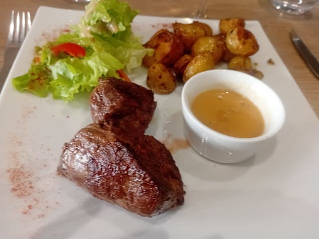 3.5/10This place was easy to find, and being one of four restaraunts in town to eat. Unfortunately myself and my wife chose this one. The food was ok and tasty, but tiny portions meant we had to eat lots of bread with our meagre meal to feel like we had eaten. The other diners were friendly locals, but the small french chap who served us did not like english customers! We waited 40 minutes for the bill, and were insulted by the small chap as we had to keep asking for it ! He was more interested in mocking us in front of the regulars, who took a dim view of his behaviour. Shame Next time we will dine at one of the other three places in town!