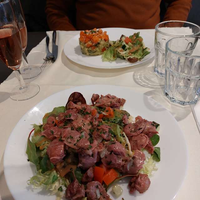 6/10The waitress was extremely pleasant and efficient and intelligent, but she was not the owner, who had forbidden the heating to be turned on. Despite several layers of coats we were very cold. The menu was short, certainly reflecting the lack of clients - 2 tables including ours. First courses were OK to good (gésiers, foie gras, tarte aux poireaux in descending order of merit). For main course we took cod (good), faux-filet (tough), côté de bœuf (mostly inedibly tough). By now our hopes for dessert were very reduced and we were not surprised:- 2 desserts (moelleux au chocolat And crème brûlée) better served hot or at least warm were cold, and the tarte de poire aux amandes was OK so long as the pastry was ignored. Lovely bordeaux wine, completely wrongly listed, and so a bit of a bargain.