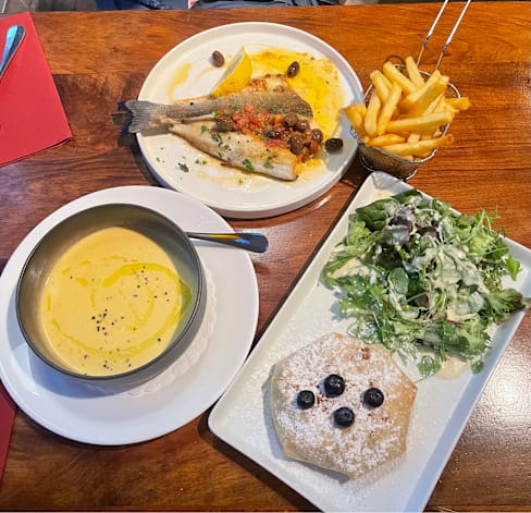 8/10A fantastic meal from start to finish! The Seafood Linguine had a rich, flavorful tomato sauce that coated the pasta perfectly. The steak was tender and juicy, complemented by a creamy sauce, crispy fries, and a side of sautéed vegetables. To end on a sweet note, the cheesecake was smooth, creamy, and just the right level of sweetness—a perfect finale to a great dining experience. Highly recommend!"