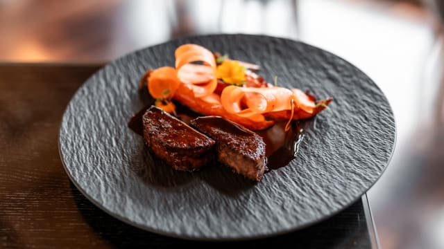 Paleron de bœuf, cuit 12 heures à la bière carmine de brasseire la mine, carottes fanes confites au miel (suisse), pickles de carottes et jus corsé à l'estragon