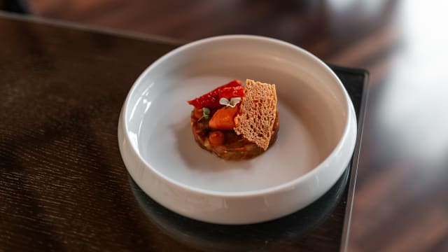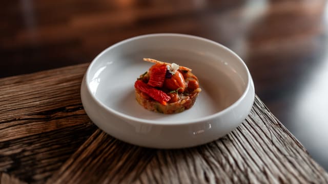 Tartare de tomates anciennes, basilic, pétales de tomates confites, focaccia croustillante et sorbet tomates cœur de bœuf
