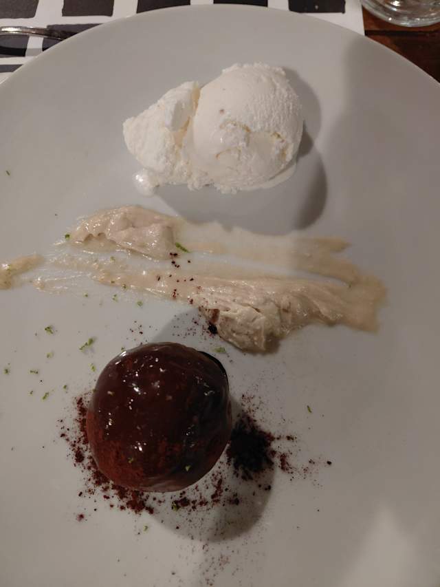 - Bavarese al cioccolato fondente, anice stellato e lime con gelato al fiore di latte e crema al sesamo