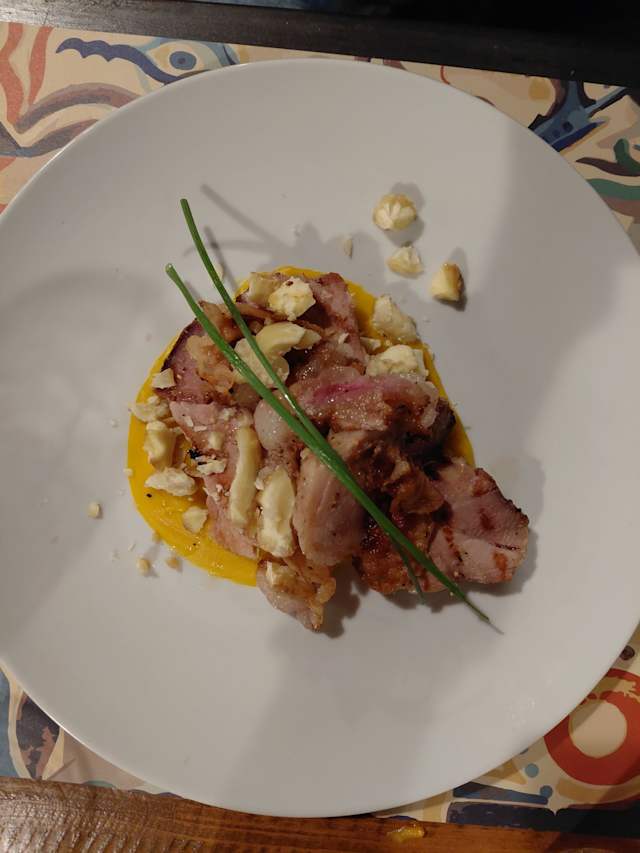 - Spalla di maiale cotta a bassa temperatura marinata alla senape di Digione su crema di zucca, castagne e lardo croccante