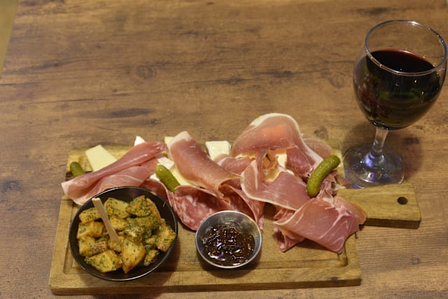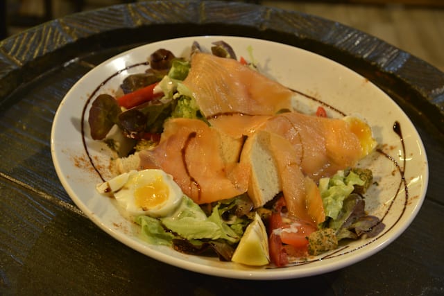 Salade, tomates, jambon serrano, chèvre chaud sur tranches de pain toastées, vinaigrette